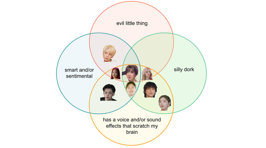 people i cry over, organized into a venn diagram. the closer to the middle the idol is, the stronger i bias them.